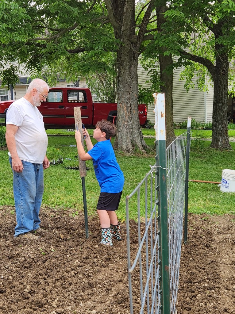 As the season progresses we keep adding new plants to the garden. Grandpa put Ethan to work.