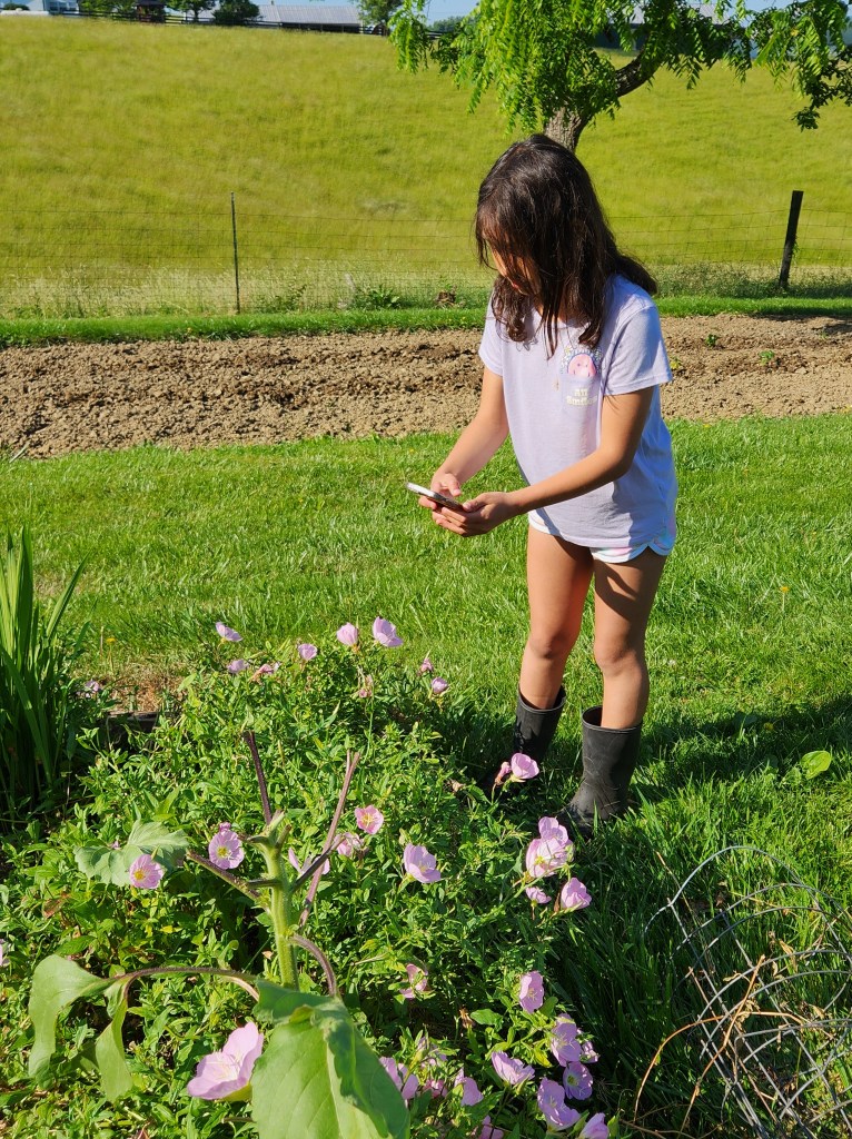Anna had been planting seeds but took a break to identify a plant.
