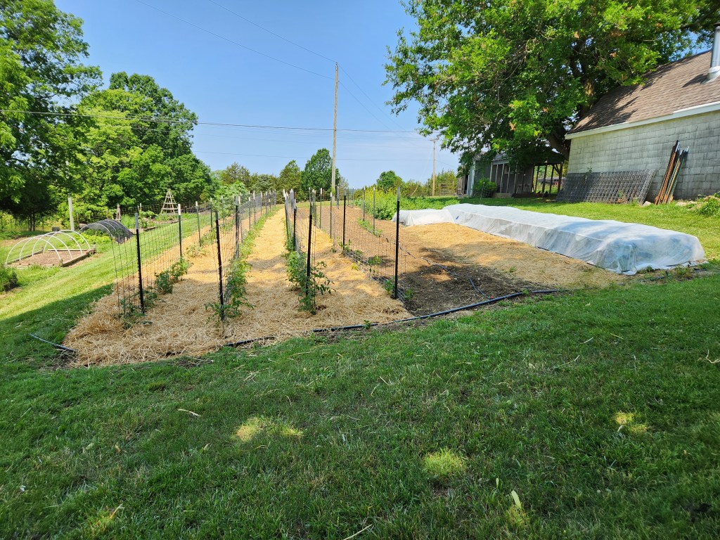 Broccoli, cauliflower and cabbage are grown under cover to protect from insects. Tomatoes are trellised with cattle panels.